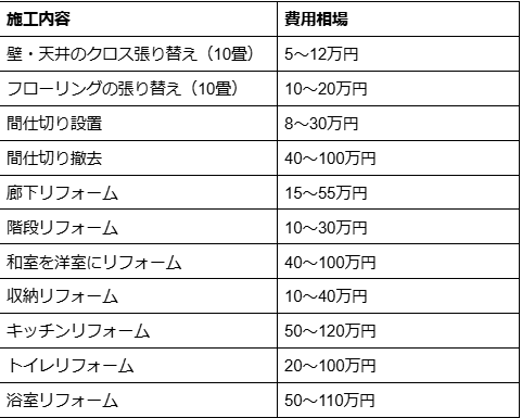 施工内容ごとの費用相場は、以下の通りです。