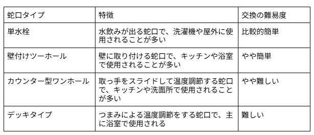 水栓の種類によっては、蛇口交換が難しい場合もあります。主な蛇口タイプと交換の難易度は、以下の通りです。