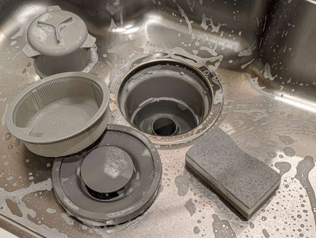 排水溝の蓋、ゴミを受ける網、お椀のような部品など、外せるものは全部外します。古い歯ブラシでゴシゴシ洗って、ヌルヌルを完全に取り除きましょう。