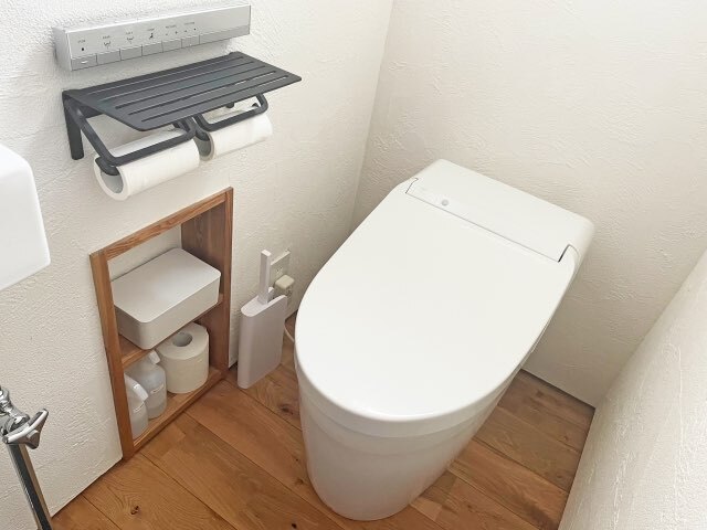 掃除道具やトイレットペーパーをしまっておく収納棚を設置すると、トイレ内がスッキリとした印象になります。収納以外にも、手すりやカウンター、手洗い鉢などを設置してレイアウトを大きく変更することも可能です。
